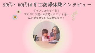 【50代・60代保育士復帰体験インタビュー】ブランク20年で不安!昔と今との違いで戸惑ったこと3選。私が乗り越えた方法教えます! 50代・60代保育士復帰体験インタビューブランク20年で不安!昔と今との違いで戸惑ったこと3選。私が乗り越えた...